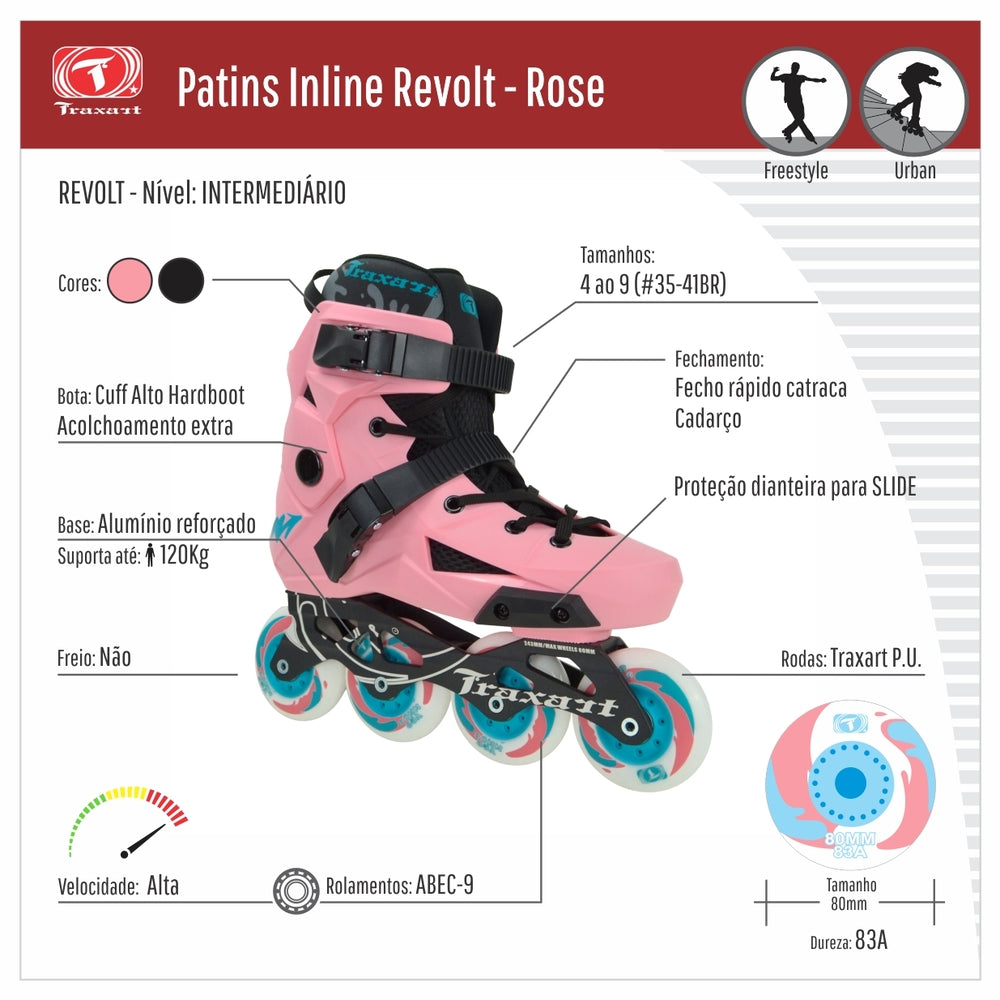 O Patins Freestyle Urban Traxart Revolt Rose é um modelo com o design bem arrojado e indicado para quem procura um patins da linha Freestyle urbano: patinação na rua que envolve saltos e descida de escadas, etc. Suporta até 120kg.